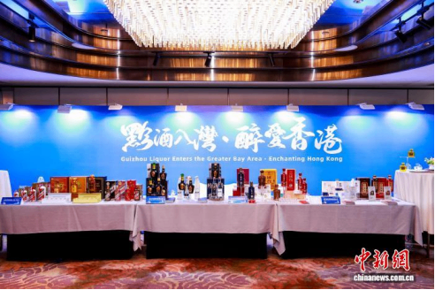11月5日,“2025贵州·香港投资贸易交流座谈会”在香港举行。图为黔酒、黔茶、刺梨、伴手礼、文创等贵州农特产品展示及品鉴区。(贵州省商务厅供图)
