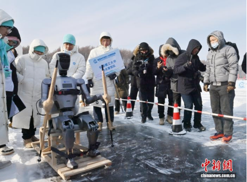 1月10日,吉林长春,一场机器人冰雪赛中,机器人坐在爬犁上挥动雪杖,在冰面上奋力滑行。 中新社记者 张瑶 摄